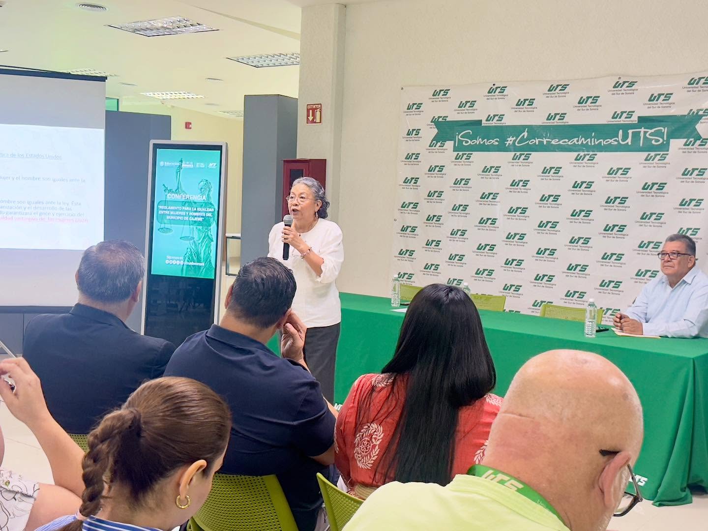 En el marco del vigésimo tercer aniversario de la Universidad Tecnológica del Sur de Sonora (UTS) y como parte de las acciones de equidad de género a favor de la comunidad universitaria, se llevó a cabo la conferencia “Reglamento para la Igualdad entre Mujeres y Hombres del Municipio de Cajeme”, impartida por la Lic. Guadalupe Hernández Flores, Coordinadora del Colectivo por la Educación, Democracia y Género e integrante del Consejo de Vinculación y Pertinencia, así como por el Lic. Guillermo Alfaro Cázares, integrante del mismo colectivo.