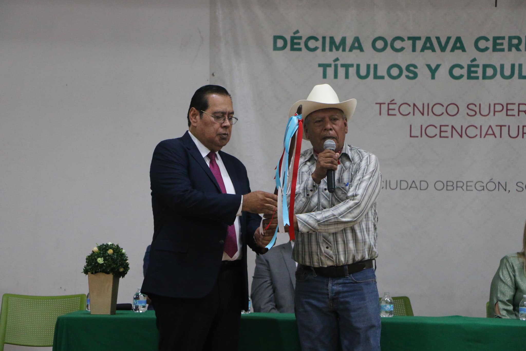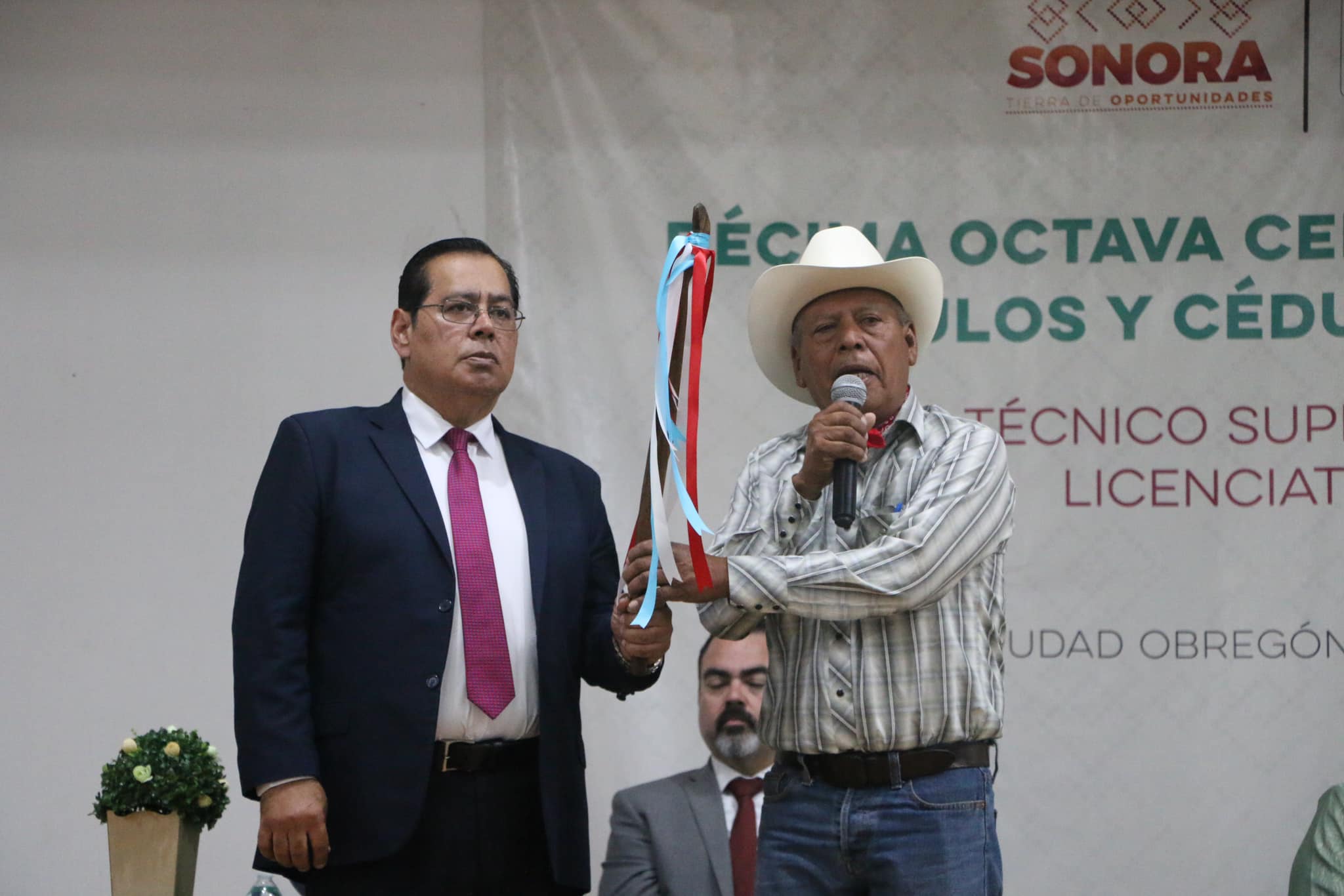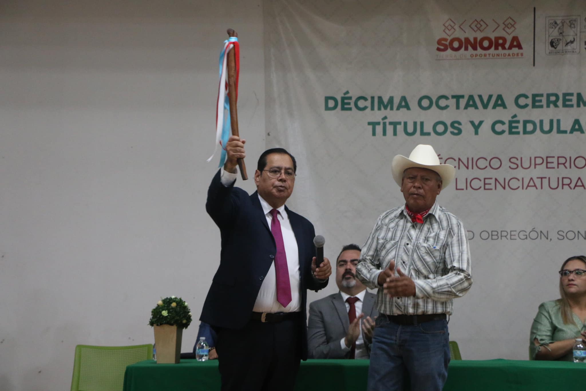 En el marco de la 18va. Ceremonia de Graduación de Técnicos Superiores Universitarios, Licenciados e Ingenieros, el Gobernador Tradicional de los Pueblos Yoreme-Mayo de la Cuenca del Arroyo del Cocoraque, Victoriano Moroyoqui, hizo entrega al Mtro. Sergio Pablo Mariscal Alvarado, Rector de la Universidad Tecnológica del Sur de Sonora, el bastón de mando como líder de nuestra Comunidad Universitaria y como símbolo del respeto y unidad hacia nuestra institución, en la que se han formado jóvenes de la etnia Mayo, Yaqui y Guarijío.